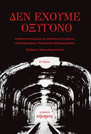 36 συγραφείς γράφουν για το έγκλημα των Τεμπών Ανθολόγηση κειμένων και φιλολογική επιμέλεια Ηλίας Φραγκάκης, Παναγιώτης Χατζημωυσιάδης. Πρόλογος Μαρία Καρυστιανού Λίγα λόγια για το βιβλίο Δεδομένου ότι η λογοτεχνία δεν μπορεί παρά να συνομιλεί και με την εποχή της, εδώ λοιπόν η δική μας πολιτική, ηθική και αισθητική ανάγκη να μιλήσουμε για το θέμα των Τεμπών υπό την ιδιότητά μας ως λογοτεχνών, ώστε να στοιχίσουμε τη λογοτεχνική γραφή με την κοινωνική φωνή για δικαιοσύνη και δημοκρατία, να αποτίσουμε φόρο τιμής στη μνήμη των νεκρών, να συμπαραταχθούμε στον αγώνα των συγγενών και να διασώσουμε για τους κατοπινούς τη λογοτεχνική βίωση όσων συνέβησαν. Γράφουν Αγγελική Αγγέλου, Κούλα Αδαλόγλου, Σοφία Αυγερινού, Γεωργία Βεληβασάκη, Νίκος Βλαχάκης, Τζούλια Γκανάσου, Βερονίκη Δαλακούρα, Γιώργος Δελιόπουλος, Διώνη Δημητριάδου, Σταύρος Ζαφειρίου, Ανωνία Ζεβόλη-Νταουντάκη, Κώστας Καναβούρης, Γιάννης Καρκανεβάτος, Ηλίας Κεφάλας, Μάνος Κοντολέων, Χλόη Κουτσουμπέλη, Μάκη Κωστούλα, Μαριάνθη Λαζαρίδου, Μαρία Λεβαντή, Ελένη Λιντζαροπούλου, Κωνσταντίνος Λουκόπουλος, Ανδρέας Μήτσου, Ευγενία Μπογιάνου, Γιώργος Μύαρης, Μαριάννα Παπουτσοπούλου, Ιωάννης Πανουτσόπουλος, Ειρήνη Παραδεισανού, Ελένη Πριόβολου, Νίκος Προσκεφαλάς, Κυριάκος Συφιλτζόγλου, Βαγγέλης Τασιόπουλος, Ευαγγελία Τάτση, Ηλίας Φραγκάκης, Παναγιώτης Χατζημωυσιάδης, Δημήτρης Χριστόπουλος, Νίκος Χρυσός. Δύο ευρώ από κάθε αντίτυπο πηγαίνει στο «Σύλλογο πληγέντων δυστυχήματος Τεμπών».