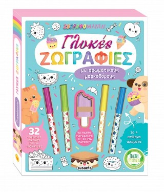 Σε αυτό το υπέροχο κουτί θα βρεις ένα μπλοκ ζωγραφικής με 32 χαριτωμένες εικόνες, για να τις ζωντανέψεις με τα χρώματα που θέλεις. Όλες τους είναι γλυκές, χαρούμενες και τρυφερές! Χάρη στους 4 αρωματικούς  μαρκαδόρους και τον πρωτότυπο μαρκαδόρο σε σχήμα παγωτού, θα έχεις όλη την έμπνευση που χρειάζεσαι για να δημιουργήσεις τις πιο ονειρεμένες σκηνές με αξιολάτρευτα ζωάκια, λαχταριστά γλυκά, καρδούλες, ουράνια τόξα και πολλά άλλα!