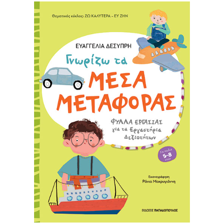 Φύλλα Εργασίας μέσα από τα οποία τα παιδιά έχουν την ευκαιρία να γνωρίσουν τα μέσα μεταφοράς, να ευαισθητοποιηθούν σε θέματα κυκλοφοριακής αγωγής     και να μάθουν να κυκλοφορούν με ασφάλεια     Εξώφυλλο για τον Φάκελο Δραστηριοτήτων κάθε παιδιού     Φύλλο Αξιολόγησης του Εργαστηρίου Μέσα σε αυτό, οι γονείς θα βρουν ιδέες για δημιουργική απασχόληση στο σπίτι και οι εκπαιδευτικοί προτάσεις για παιδαγωγική αξιοποίηση στη σχολική τάξη. Τα «Φύλλα Εργασίας για τα Εργαστήρια Δεξιοτήτων» περιλαμβάνουν διαθεματικές δραστηριότητες κατάλληλες για τους μαθητές του Νηπιαγωγείου και των πρώτων τάξεων του Δημοτικού. Σύμφωνα με το νέο Πρόγραμμα Σπουδών και τις οδηγίες του ΙΕΠ για το μάθημα «Εργαστήρια Δεξιοτήτων»