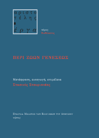 Στα 5 βιβλία του Περί ζώων γενέσεως ο Αριστοτέλης εκθέτει τη θεωρία του για την αναπαραγωγή, ίσως τοπλέον σημαντικό φαινόμενο στην έμβια φύση αφού η ανάλυση της θεμελιώνει τη θέση ότι η έμβια φύσηκαθορίζεται από τελικά αίτια: κάθε γέννηση σκοπεύει στη δημιουργία ενός ώριμου δείγματος τουφυσικού είδους στο οποίο ανήκουν οι γεννήτορες. Το πρώτο βιβλίο εξετάζει τα αναπαραγωγικά μέρη τωνζώων και επιχειρηματολογεί για τη φύση των σπερματικών εκκρίσεων αρσενικού και θηλυκού (ενάντια σεαντίπαλες ιατρικο-βιολογικές θεωρήσεις). Στο δεύτερο και τρίτο βιβλίο εξετάζεται η διαδικασία σύστασηςκαι ανάπτυξης των εμβρύων και η προέλευση των ψυχικών τους δυνάμεων (κατά σειρά στα ζωοτόκα,ωοτόκα, σκωληκοτόκα και εν τέλει στα ζώα που δημιουργούνται αυτομάτως). Στο τέταρτο βιβλίοαναλύεται το φαινόμενο της κληρονομικότητας και άλλα δευτερεύοντα χαρακτηριστικά γύρω από τιςγεννήσεις, όπως επίσης οι χρόνοι των κυήσεων και η σχέση τους με τον κοσμικό χρόνο. Το τελευταίοβιβλίο αφιερώνεται στην εξέταση χαρακτηριστικών που προκύπτουν αναγκαία, δηλαδή όχι εξ αιτίαςτελικών αιτίων (π.χ. χρώμα δέρματος και ματιών, τριχοφυϊα, φωνή, οδοντoστοιχία κτλ.). Η πραγματείαέχει ενδιαφέρον τόσο για το πώς εφαρμόζεται και αναπτύσσεται η αριστοτελική υλομορφική θεωρία, όσοκαι ως το έργο που ολοκληρώνει την αριστοτελική ζωολογία. Συνιστά δε ένα ανεκτίμητο τεκμήριο καιπηγή για την ιστορία της ανάπτυξης της αρχαίας επιστήμης.Ο τόμος περιλαμβάνει εισαγωγή, σχολιασμό όπως και ευρετήρια χωρίων, όρων και ονομάτων.