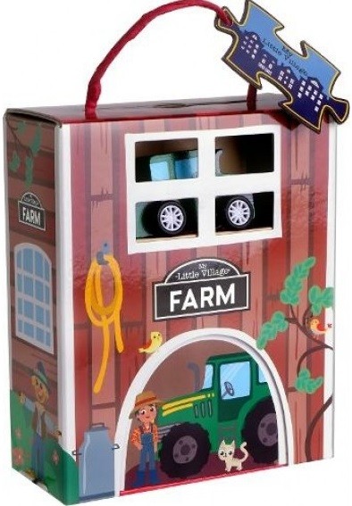 Περιεχόμενο κουτιού: Βιβλίο 16 σελίδων με πληροφορίες για τα τρακτέρ, τα ζώα και την καθημερινότητα στο αγρόκτημα, 1 ξύλινο τρακτέρ με ρόδες, 1 κουτί που μεταμορφώνεται σε αγρόκτημα, παζλ με 16 μεγάλα κομμάτια που σχηματίζει την πόλη γύρω από το αγρόκτημα, παιχνίδι ταιριάσματος στην πίσω πλευρά των κομματιών του παζλ, 6 φιγούρες από χαρτόνι και σελίδα οδηγιών.